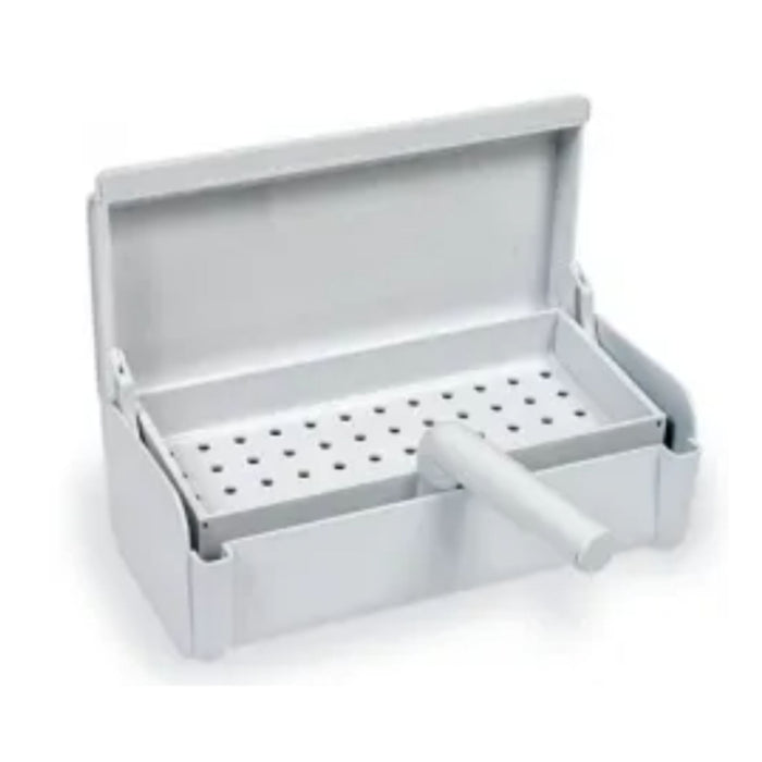 Tap out slid and sterilization tray. Lift-out tray allows easy removal of items being sterilized. A 31-day slide index reminds you when sterilant liquid needs to be changed