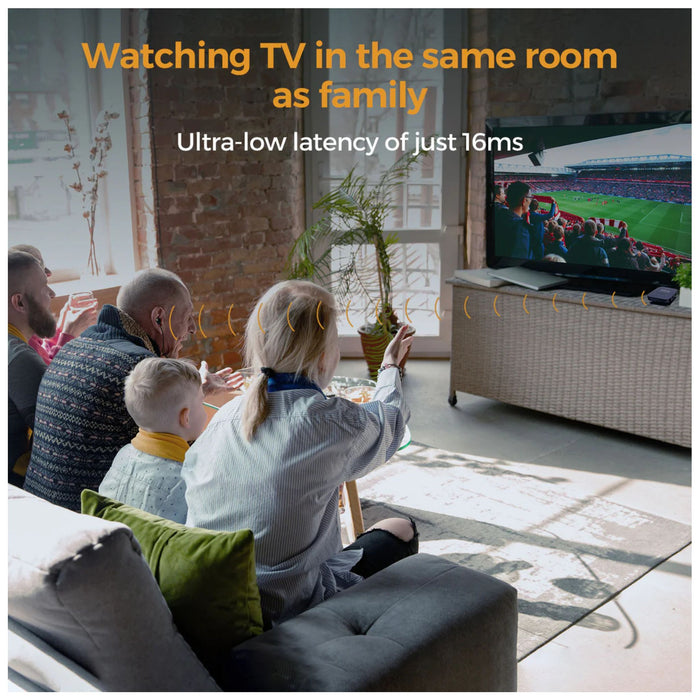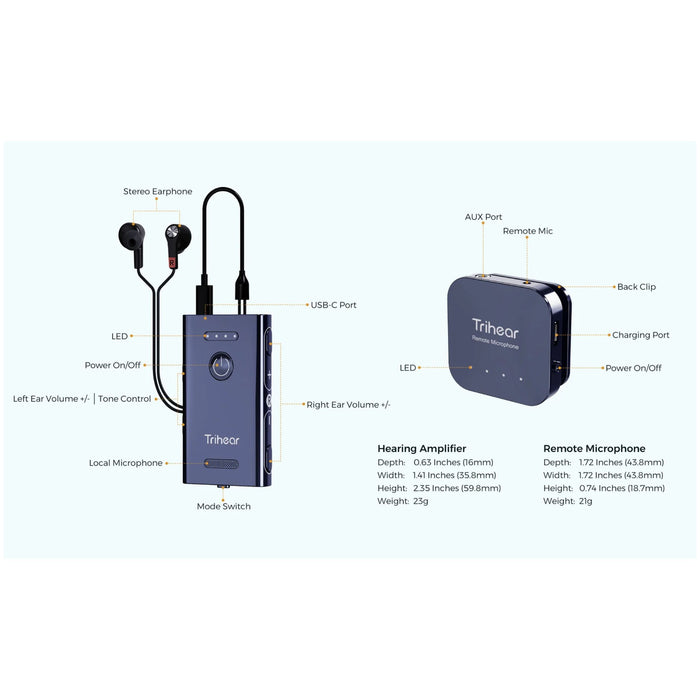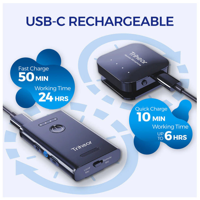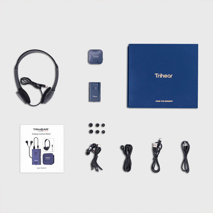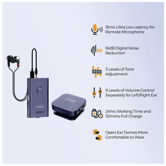 The Trihear Convo More offers super easy connection with a single toggle switch, allowing you to connect to the remote microphone in just 1 second for clear communication in noisy environments. With 16ms ultra-low latency , it ensures fluid, uninterrupted conversations up to 98ft/30 meters. It also works as a TV streamer, delivering crystal-clear sound to your earphones. Suitable for up to a sever hearing loss, it features 9 levels of volume control, separate volume adjustments for each ear, and 5 levels of tone control for bass and treble. The open ear domes offer comfort for extended use, and with just 10 minutes of charging, you get 6 hours of battery life, or up to 24 hours with a 50-minute charge.